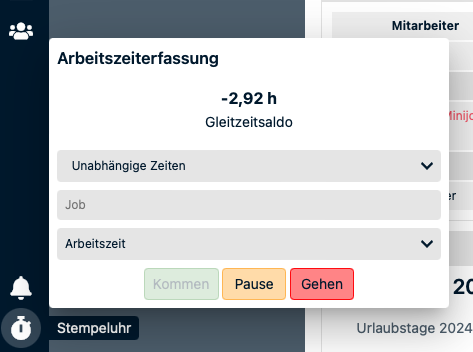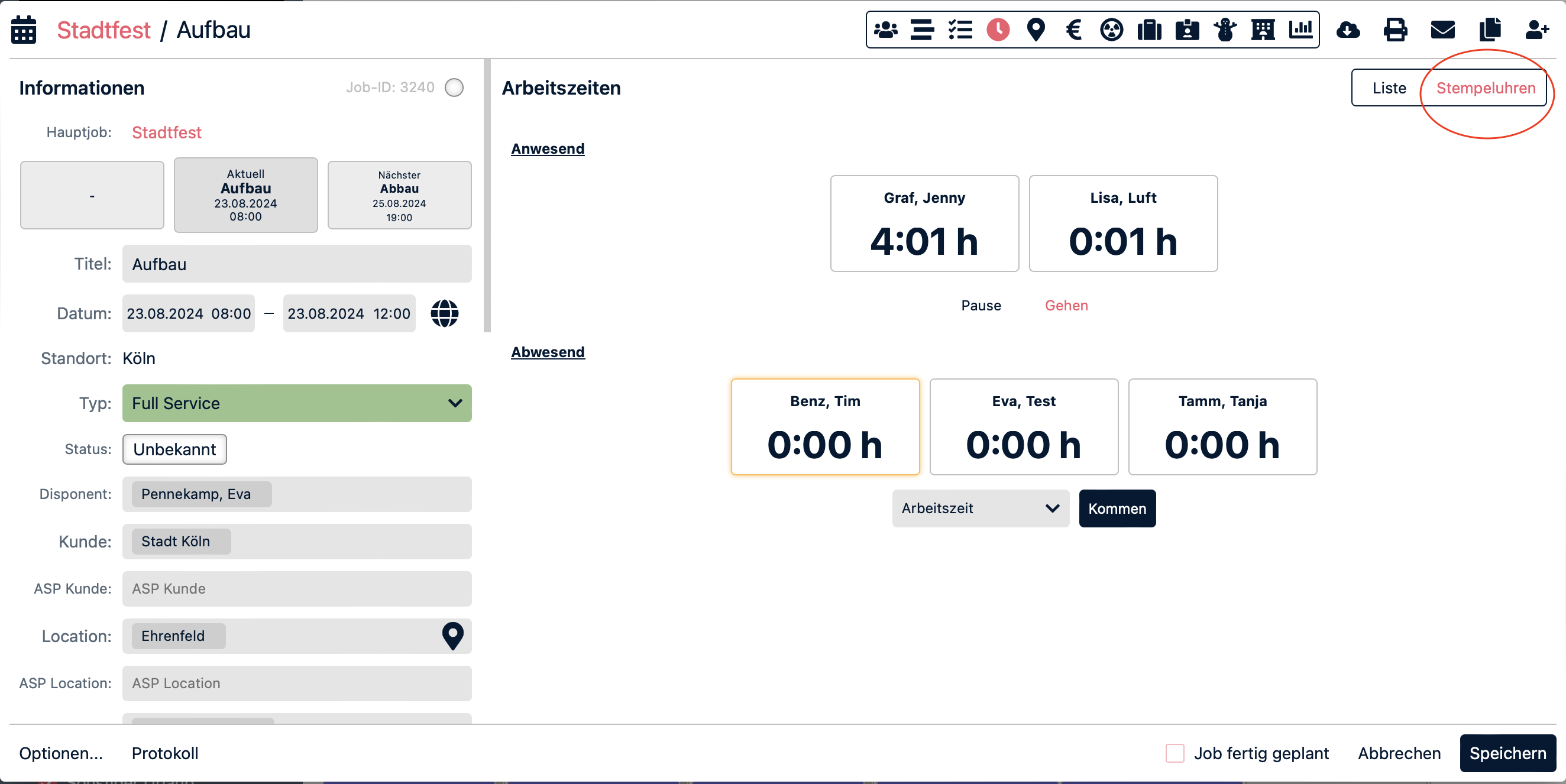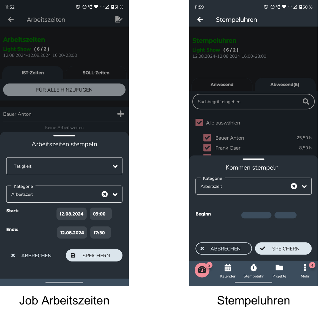 Hierüber kann der Projektleiter die Stempeluhr für einzelne Personen oder für alle Personen, die in den Job gebucht sind, starten. Dabei kann die Startzeit, falls erforderlich, angepasst werden. Analog kann die Pause, bzw. das Arbeitsende erfasst werden.