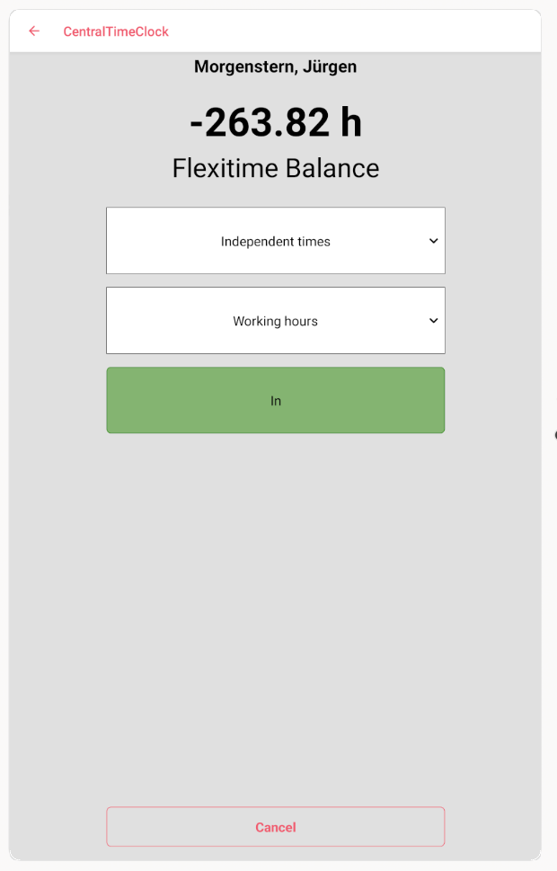 Schritt 1: RFID-Chip an den RFID-Reader halten. Der Nutzer wird erkannt und sieht die Maske zur Erfassung von Arbeitsbeginn.