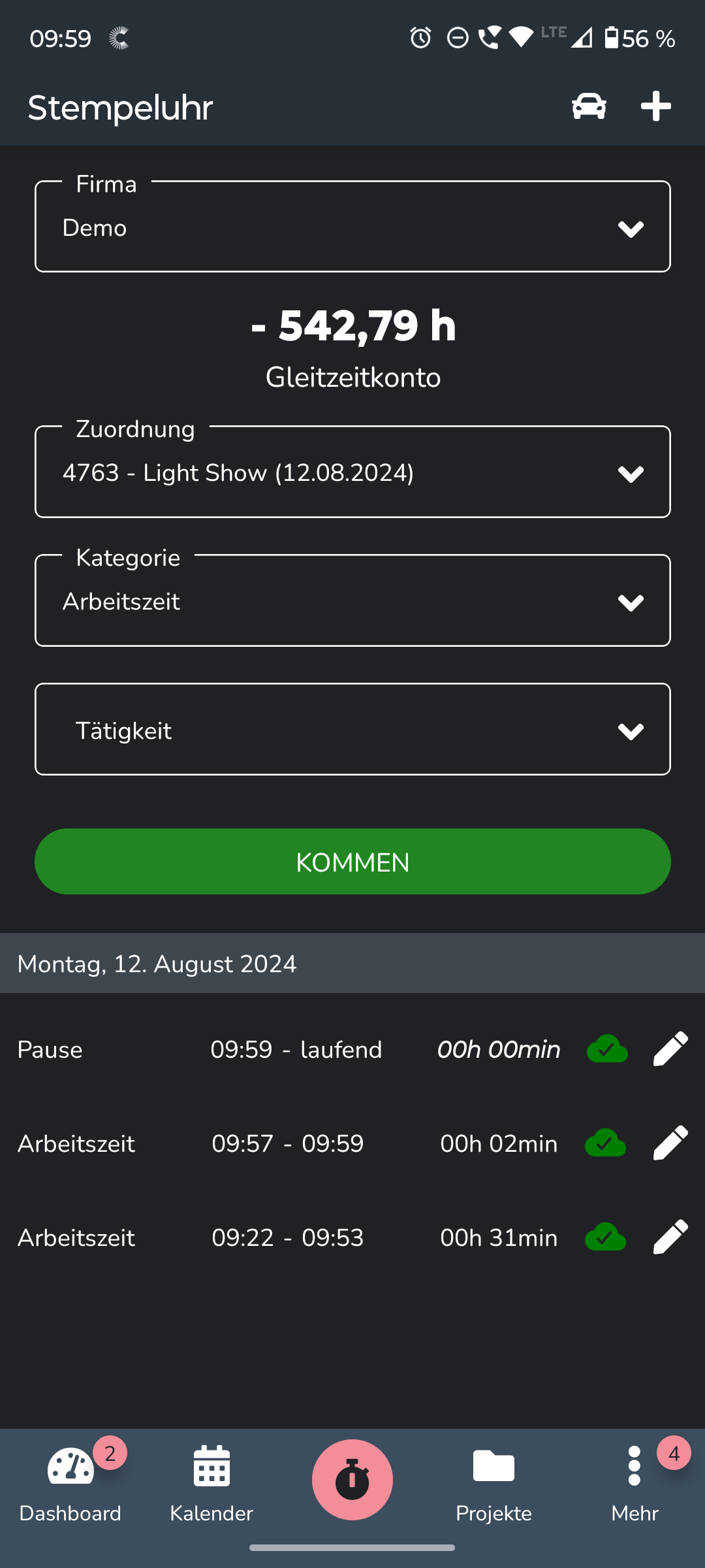 Schritt 2: Startzeit erfassen über den grünen Button „Kommen“