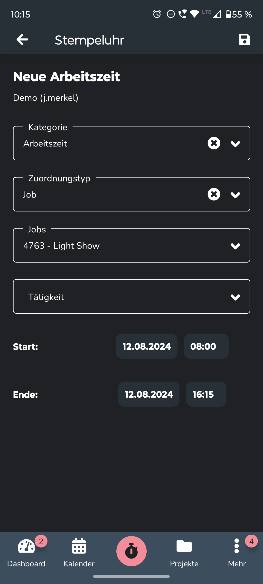 Schritt 3: Arbeitszeit eintragen - wählen Sie die Kategorie „Arbeitszeit“ aus, sowie ggf. das Projekt/den Job auf welchen die Zeit gebucht werden soll. Dann können Sie im unteren Bereich Start- und Endzeit der Arbeitszeit eintragen. Speichern Sie die eingetragenen Zeiten, indem Sie oben rechts auf das Disketten-Symbol gehen.