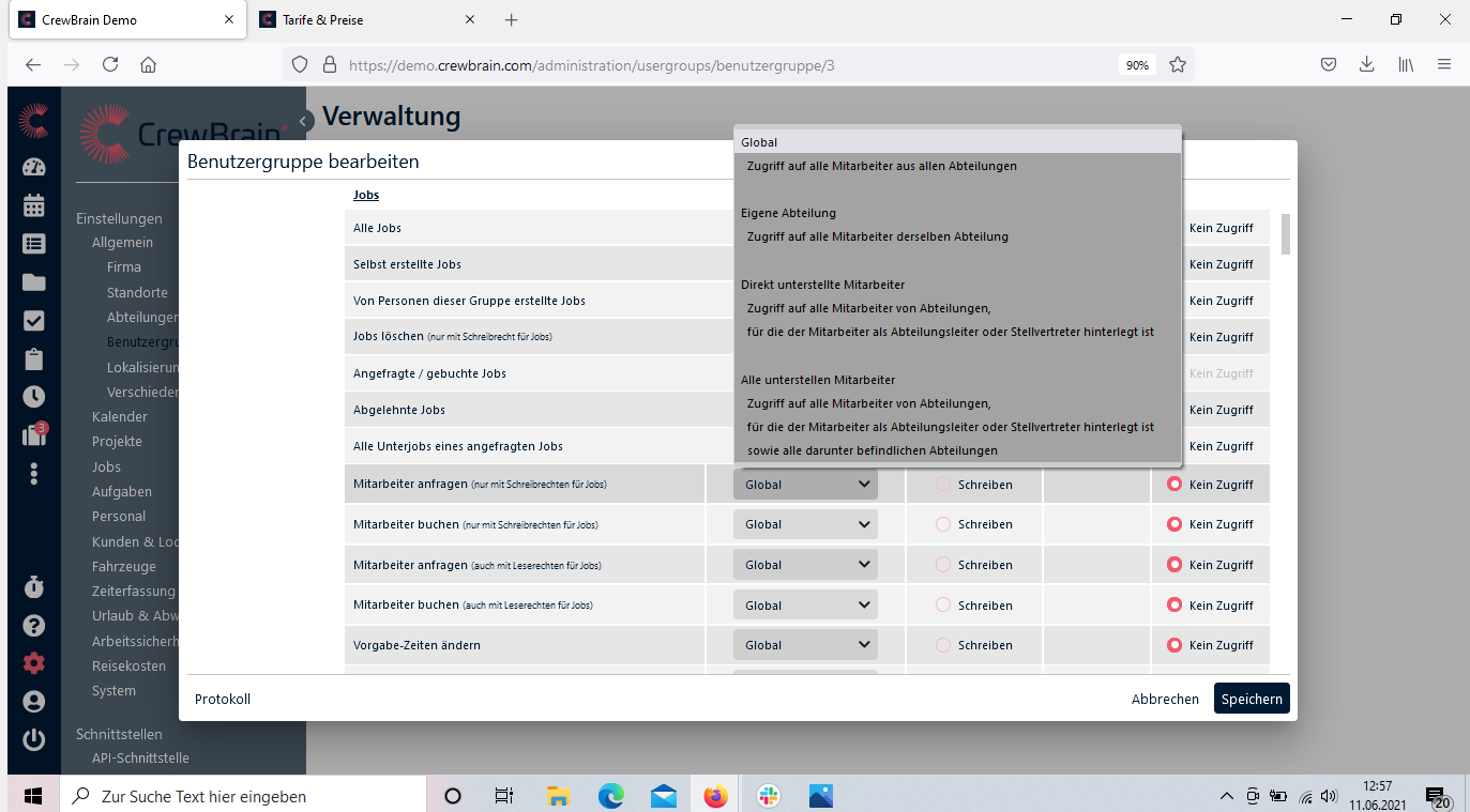 Bis auf die Benutzergruppe “Administrator” können Sie unter Verwaltung > Allgemein > Benutzergruppen die Rechte aller anderen Benutzergruppen definieren oder neue Gruppen anlegen. Mit den vielen Konfigurationsmöglichkeiten können Sie so die Hierarchie Ihres Unternehmens perfekt abbilden. Denn Schreibrechte können nicht nur “global”, sondern auch auf die eigene Abteilung oder unterstellte Mitarbeiter beschränkt, vergeben werden.