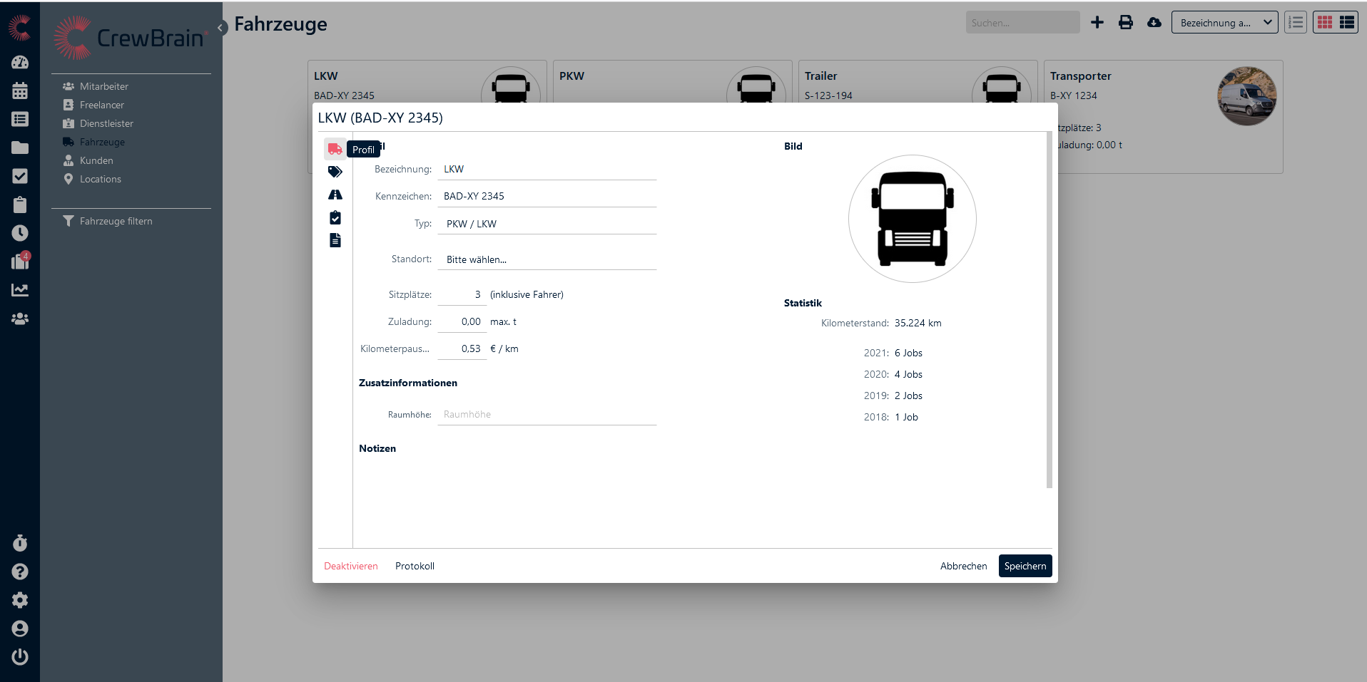 Geben Sie hier alle Informationen zu Ihrem Fahrzeug an, wie auch den Preis pro Kilometer als Pauschale. Unter Verwaltung > Fahrzeuge > Zusatzinformationen können weitere Datenfelder dazu angelegt werden. Sie können ein oder mehrere Fotos hochladen und sehen in der Statistik den aktuellen Kilometerstand und die Anzahl der Jobs, für die das Fahrzeug gebucht wurde. Um zu sehen, um welche Jobs es sich handelt, kann man diese auch anklicken.