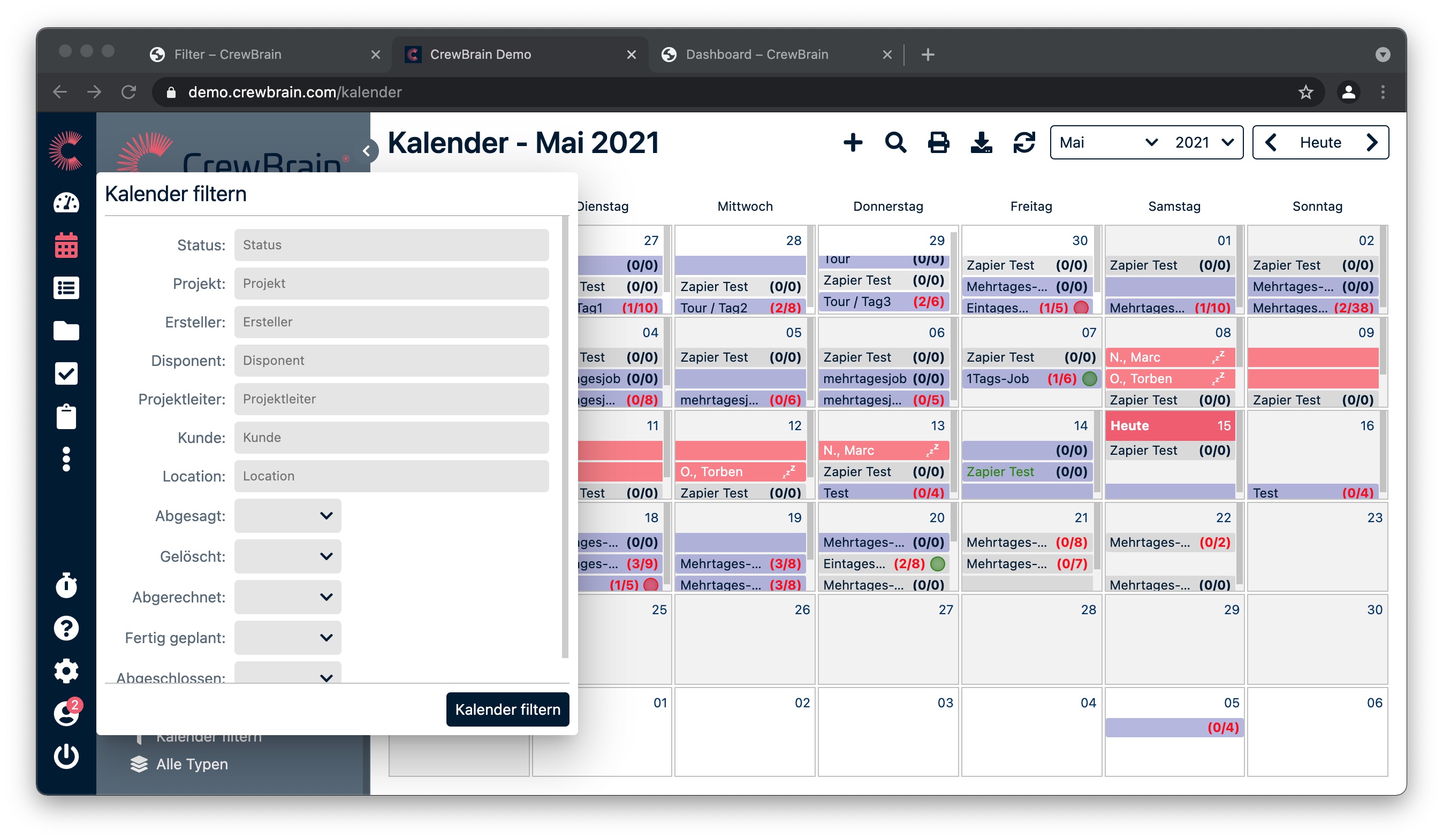 With the numerous options for setting filters, CrewBrain always offers you the optimal overview. Filters can be set in all calendar views. Simply check or uncheck the boxes wherever you want to display exactly what you need or are looking for in the calendar. At the bottom of the navigation — except in the bar view and overviews — you will find the function "Filter calendar," which allows you to filter by project or job details. In the bar view, planning view, and overviews, there is an additional filter called "Filter employees."