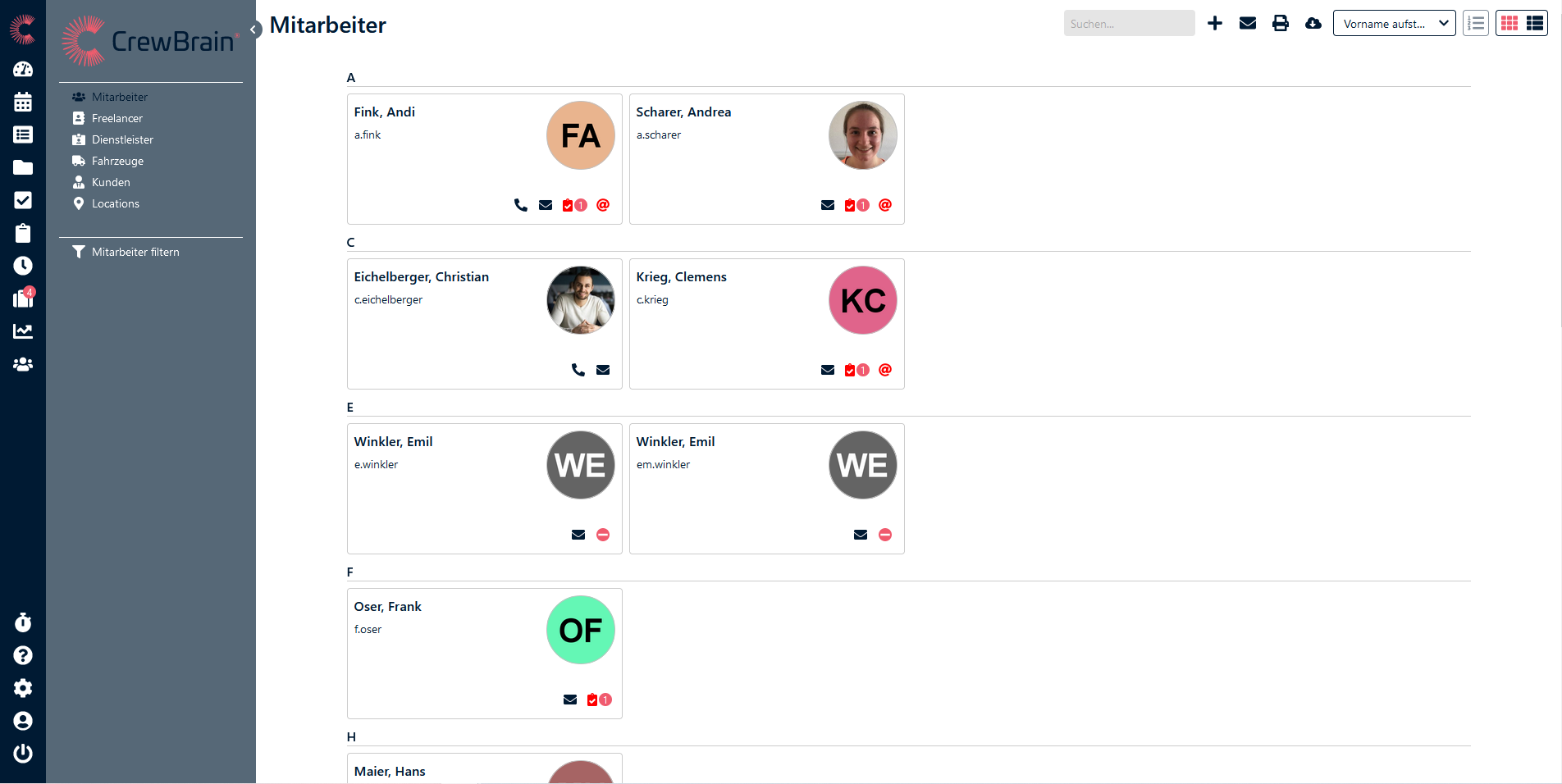 In the base data, users start by default in the grid view with business cards. This provides a quick overview of the most important information about the respective base data object, which can also be contacted directly via the corresponding icon. For personnel, additional information such as missing certificates or invalid email addresses is also displayed. Click on a base data object to access the detail view, or on the plus sign at the top right to create a new one.